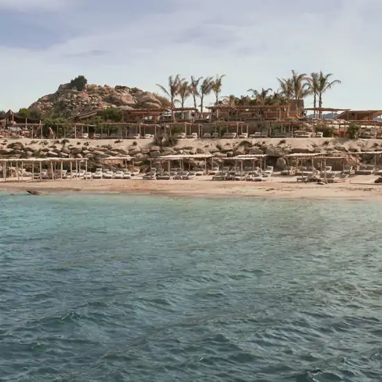 Bohemian design and barefoot luxury at their purest form are to be found at Scorpios Mykonos, a beach club that blends in with its natural environment so profoundly that you might not even realise that it is standing there. Earth tones, natural elements and materials, wood, wicker, and stone have been put together in order to make a one-with-nature haven for the elite. Consisting of a sandy beach, an open-plan restaurant, and a sunset beach, where the music rituals take place, Scorpios was created as a gathering place meant to host the artistic, spiritual, and social life of its community. Here you will feast on Mediterranean dishes mostly created to be shared, following the communal mentality of the place, and prepared with local ingredients, traditional methods, and the presence of just the right dosage of international influences. Wooden cabanas and lush sunbeds can make you feel at home during your treasured beach hours, while indulging in divine cocktails, refined dishes, and sophisticated sounds. The music rituals are quite the thing here, with renowned artists from all over the world working their magic and peripheral underground artists experimenting with new sounds and music genders. The sunset music ritual is not to be missed under any circumstances, and that is a fact!